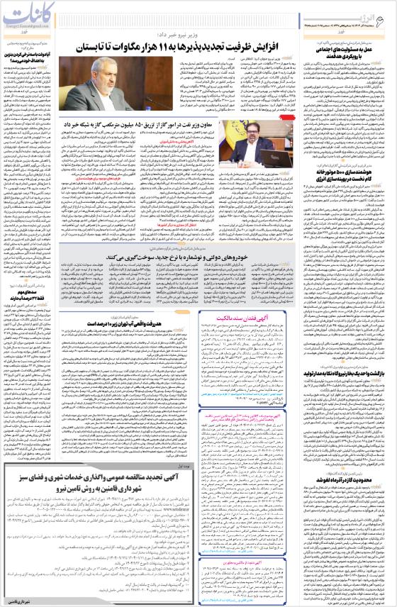 افزایش ظرفیت تجدیدپذیرها به ۱۱ هزار مگاوات تا تابستانمعاون وزیر نفت در امور گاز از  تزریق ۸۵۰ میلیون مترمکعب گاز به شبکه خبر دادخودروهای دولتی و نوشماره با نرخ جدید سوخت‌گیری می‌کنندهدررفت واقعی آب تهران زیر ۱۰ درصد استعمل به مسئولیت‌های اجتماعی