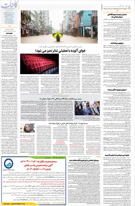 جاری شدن سیل در تایلند - رویترزهوای آلوده با تعطیلی تئاتر تمیز می شود؟رئیس سی و هفتمین نمایشگاه بین‌المللی کتاب تهران معرفی شدمرضیه برومند:  تمرکز رویدادهای هنری در تهران پایان یابدسینمای اجتماعی درگیر تغییر ذائقه مخاطب است«اسباب زحمت» سعید آقاخانی
