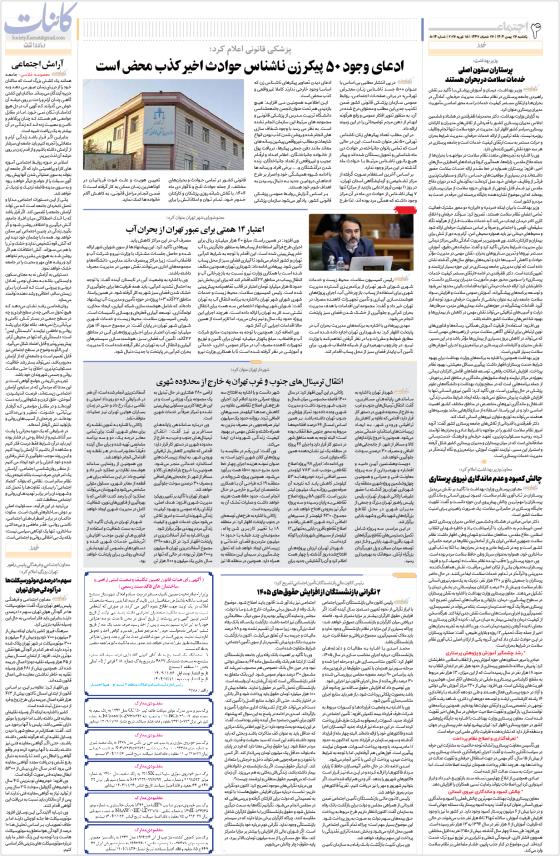 ادعای وجود ۵۰ پیکر زن ناشناس حوادث اخیر کذب محض استاعتبار ۱۴ همتی برای عبور تهران از بحران آبانتقال ترمینال‌های جنوب و غرب تهران به خارج از محدوده شهری۲ نگرانی بازنشستگان از افزایش حقوق‌های ۱۴۰۵پرستاران ستون اصلی