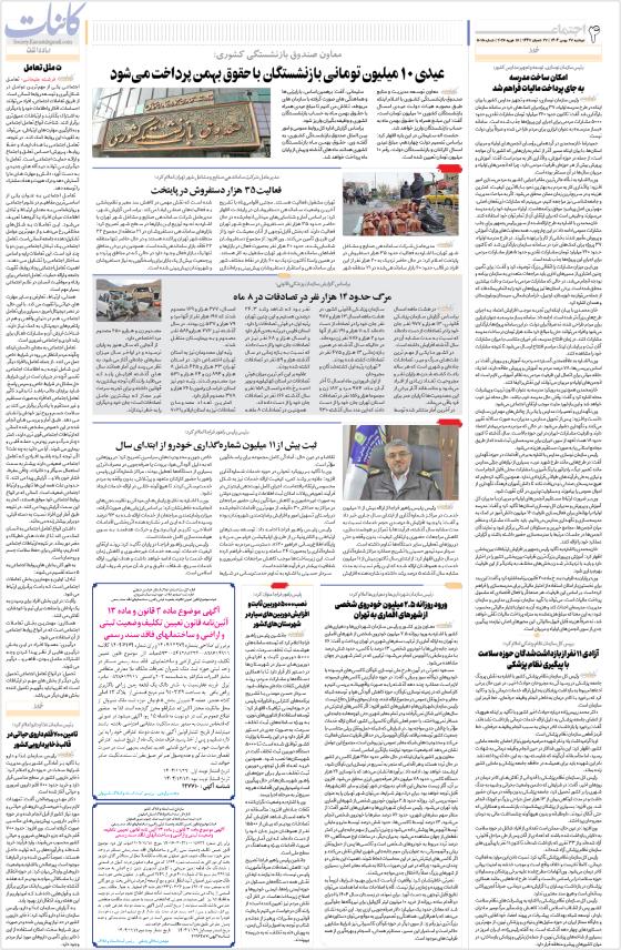 عیدی ۱۰ میلیون تومانی بازنشستگان با حقوق بهمن پرداخت می‌شودفعالیت ۳۵ هزار دستفروش در پایتختمرگ حدود ۱۴ هزار نفر در تصادفات در ۸ ماهثبت بیش از ۱۱ میلیون شماره‌گذاری خودرو از ابتدای سالورود روزانه ۲.۵ میلیون خودروی شخصی