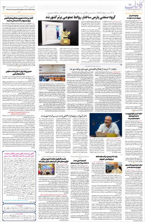 گروه صنعتی پارس ساختار؛ روابط عمومی برتر کشور شدمالیات ۷۰ درصد از فعالان اقتصادی شهرستان مراغه صفر شددانش‌آموزان، پرچم‌داران آگاهی و امید درمسیر آینده شهرهستندرشد ۴۸ درصدی درآمد هفت‌ماهه