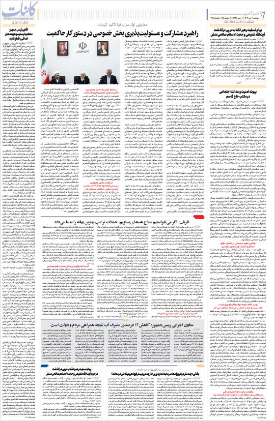 راهبرد مشارکت و مسئولیت‌پذیری بخش خصوصی در دستور کار حاکمیت ظریف: اگر می‌خواستیم سلاح هسته‌ای بسازیم، حملات ترامپ بهترین بهانه را به ما می‌داد معاون اجرایی رییس‌جمهور: کاهش ۱۲ درصدی مصرف آب نتیجه همراهی مردم و دولت استبقائی: چند نفر در تاریخ معاصر ما به اندازه وزیر خارجه در زمینه رفع تحریم تلاش کرده‌اند؟ پیام تسلیت رهبر انقلاب در پی درگذشت