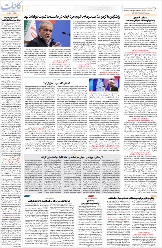پزشکیان: اگر در خدمت مردم باشیم، مردم هم در خدمت حاکمیت خواهند بود آمادگی کامل  برای دفاع از ایران لاریجانی: نیروهای امنیتی سرخط‌های اغتشاشگران را شناسایی کردند بقائی: با طرفی می‌توان وارد مذاکره شد که به دنبال جنگ نباشدبا همه توان
