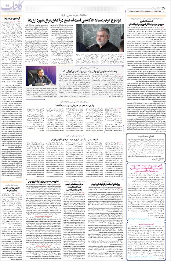 موضوع حریم مساله حاکمیتی است نه منبع درآمدی برای شهرداری‌هابیمه معلمان مدارس غیردولتی بر اساس میزان تدریس اجرایی شدپایان سدمعبر در خیابان شهرزاد منطقه ۱۵لزوم سرعت در ایمن سازی بیمارستان‌های ناایمن تهرانپروژه فتح گره‌گشای ترافیک غرب تهرانامن‌ترین و منظم‌ترین اربعین